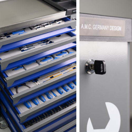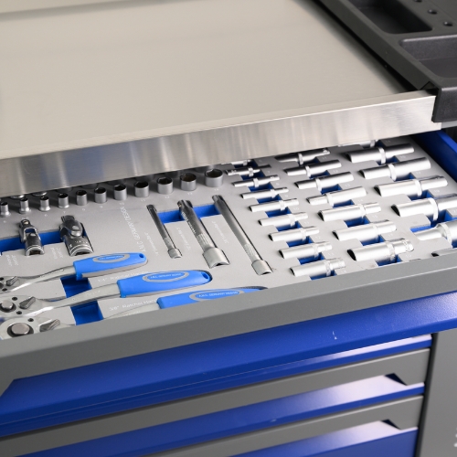 Il carrello e' dotato di piu' cassetti scorrevoli montati su guide metalliche robuste ciascuno organizzato con inserti in foam sagomato che mantengono ogni utensile nella propria sede garantendo ordine protezione e rapidita' di accesso.