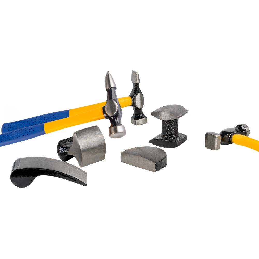 Kit composto da 7 pezzi per carrozzieri di cui 3 martelli per battere e 4 tassi per le piu' svariate situazioni.