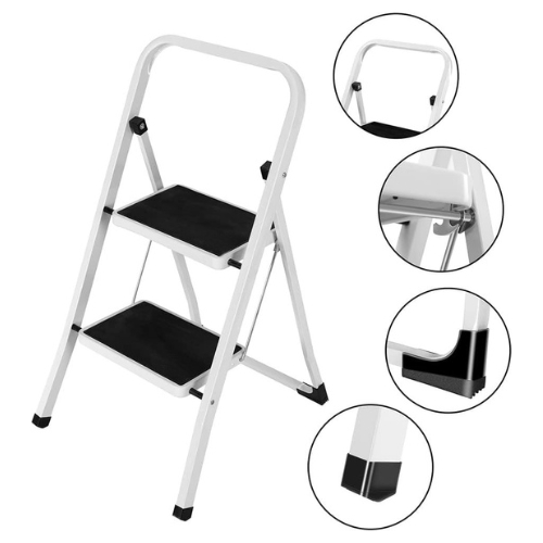 Dotata di piedini antiscivolo che conferiscono alla scala un eccellente stabilita' e di maniglione di sicurezza con presa antiscivolo che oltre a garantire maggiore sicurezza facilita anche il trasporto della scaletta. Questa scaletta e' molto flessibile nell'uso, de' possibile utilizzarla come scala per le attivita' casalinghe ma anche come pratico sgabello.